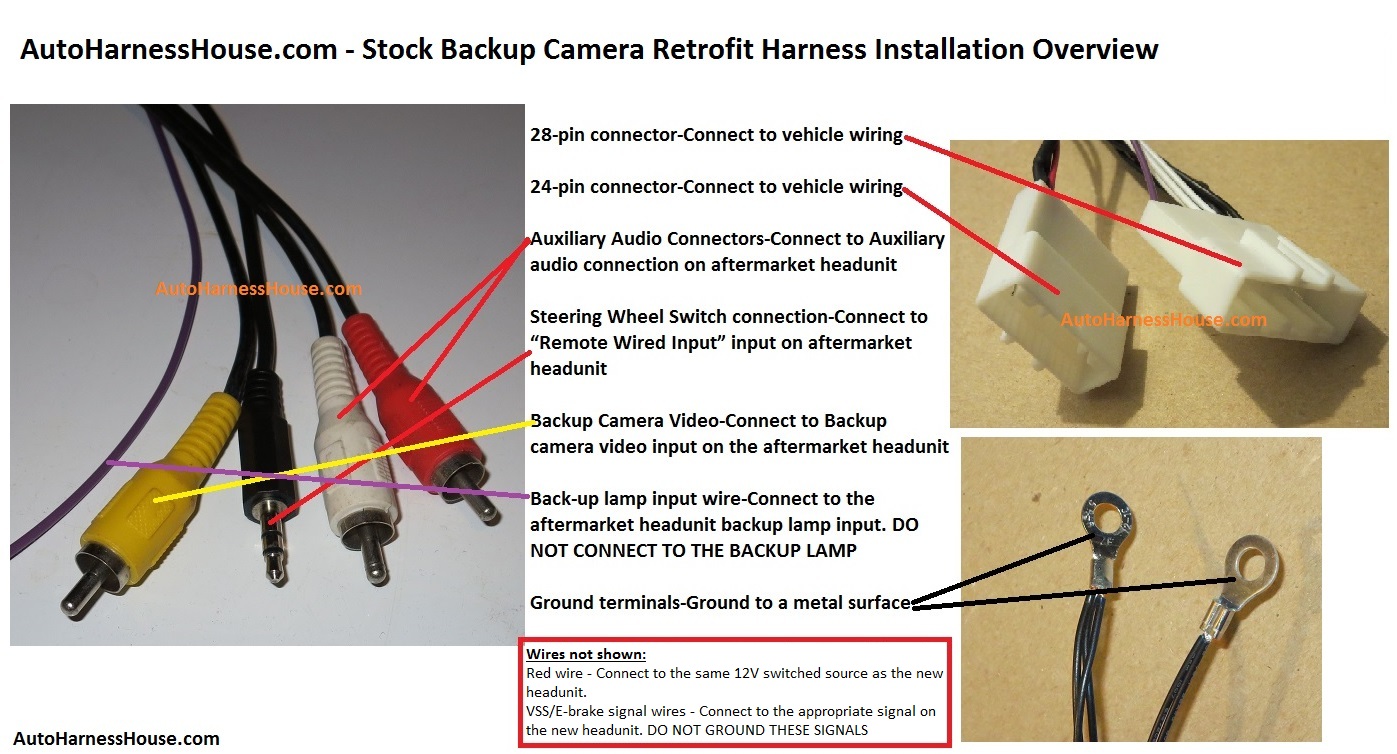 -Connect the purple wire to the back-up lamp input wire on the new headunit. This is the wire that triggers the backup camera when your car is shifted into reverse. There is no need to connect the headunit wire to the backup lamp. This harness provides that connection.